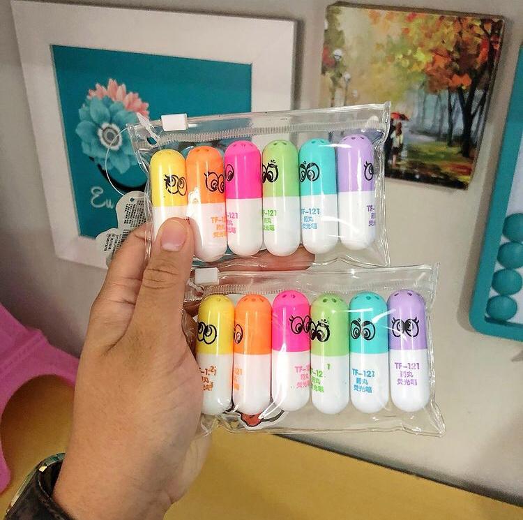 Kit com 06 marca textos cápsula. Cores: amarelo, laranja, rosa, verde, azul e lilás. Todas neon.